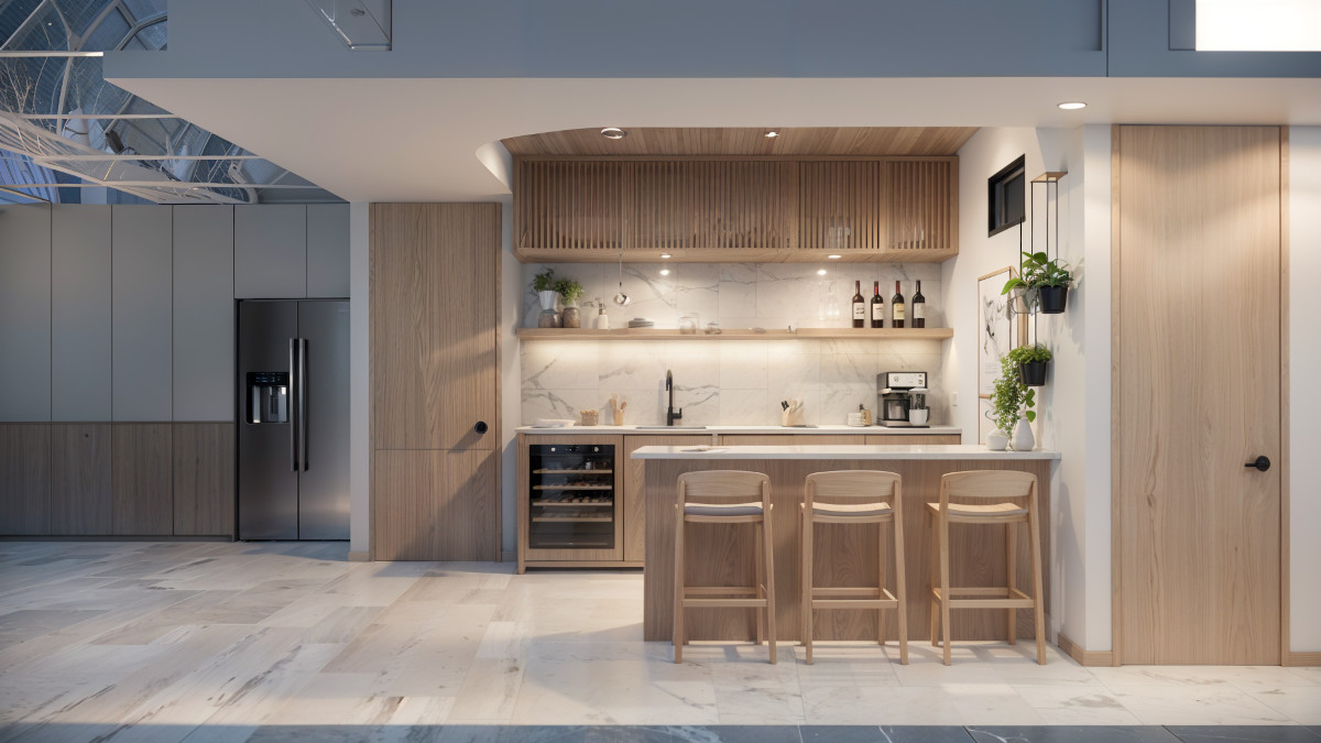 The furniture was designed around two concepts: a bar and a seating area arranged linearly and efficiently. The first included a small social area with armchairs and a low table, suitable for breaks or gatherings. The second featured a bar with stools that connected to the dining area, maintaining aesthetic coherence.