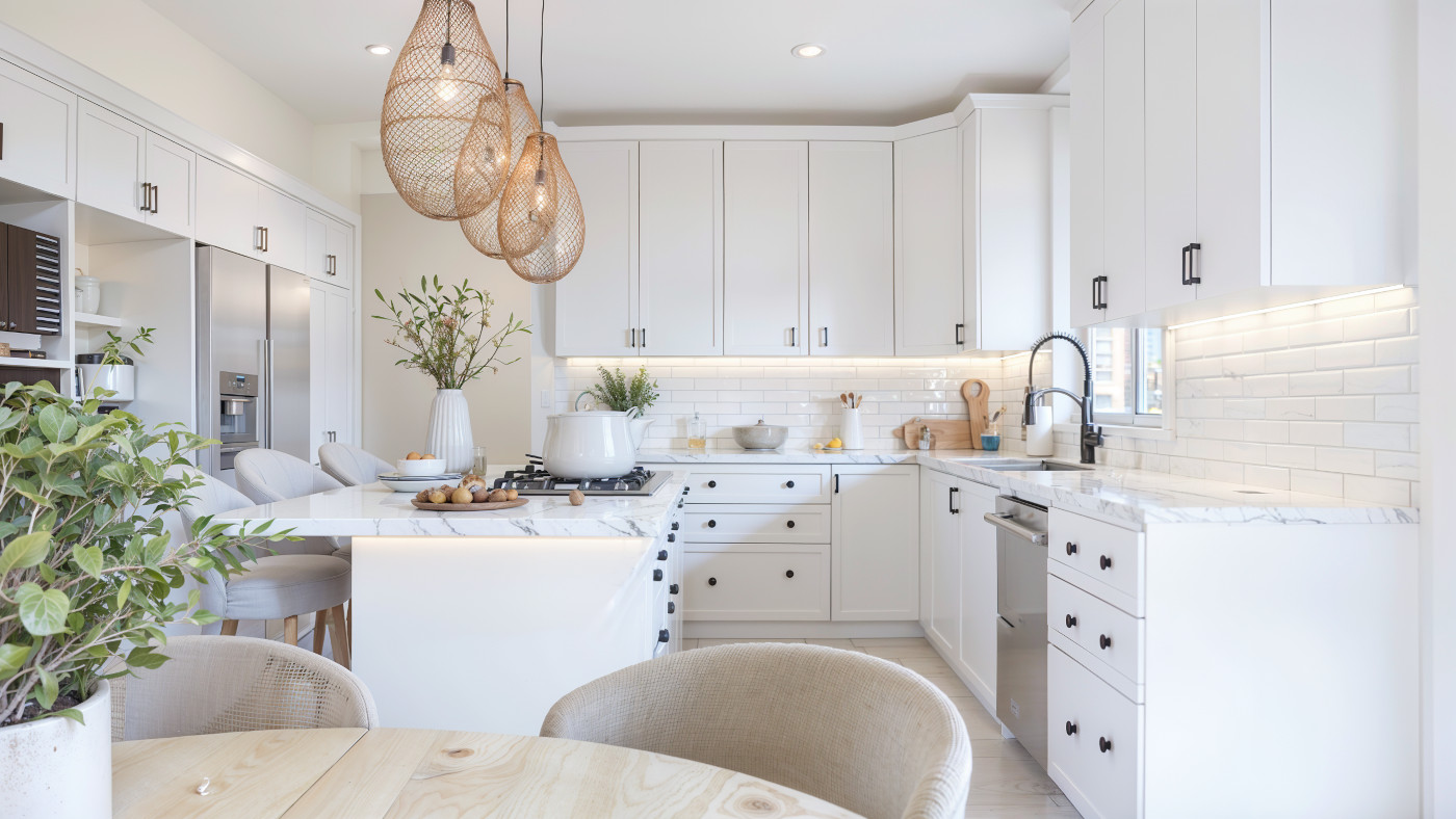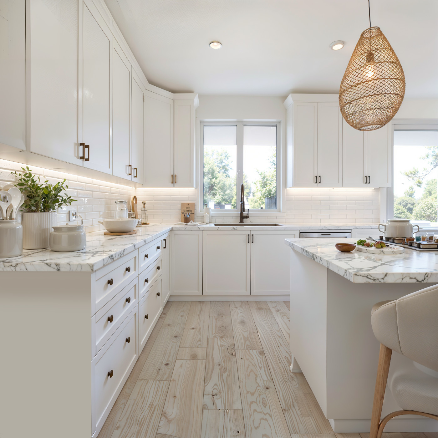 The L-shaped layout was structured around a central breakfast table in light wood, paired with upholstered chairs that were comfortable and easy to maintain. White dominated the space: cabinets, walls, and ceramic finishes formed a neutral palette, enhanced by natural light entering through floor-to-ceiling windows.