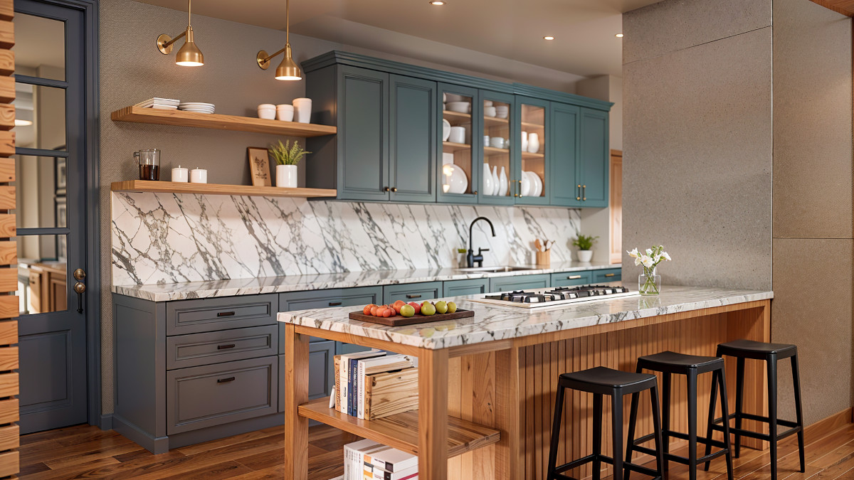 Warm-toned natural wood was the primary material, used in cabinetry, open shelving, and flooring. It was paired with white veined marble on work surfaces and backsplash. Upper cabinets in a muted blue-gray introduced contrast, while metal handles and brass light fixtures added subtle accents.